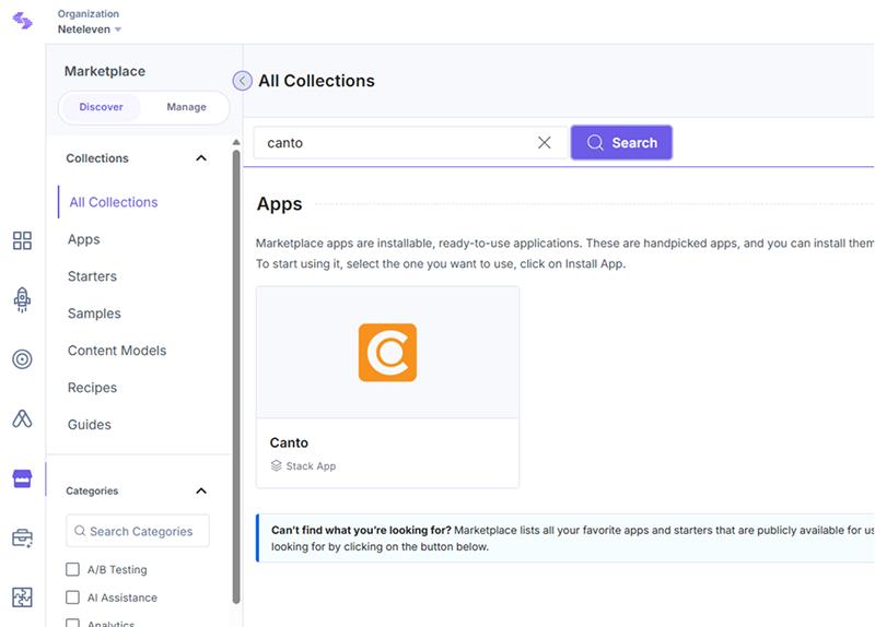 Designed for joint Canto and Contentstack customers with Media Delivery Cloud enabled, it streamlines your publishing workflow and ensures brand assets are always at your fingertips. Simply install the Canto App from the Contentstack Marketplace and authorize it through your Canto settings.